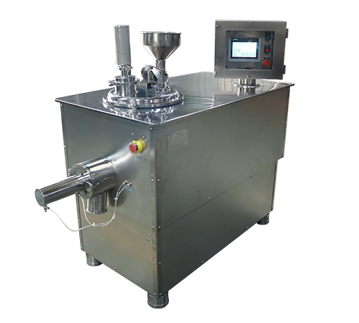 本機(jī)用于制藥工業(yè)中的固體制劑生產(chǎn),集傳統(tǒng)制粒工藝中的混合和制粒兩道工序與一體同時進(jìn)行,其制粒過程是先把粉料投入料筒內(nèi)經(jīng)攪拌漿形成翻滾狀態(tài),使不同性質(zhì)的粉料得到徹底的混合,然后逐量加入粘合劑。(通過攪拌漿和筒壁對物料的擠壓、揉合,使其形成潮濕均勻的軟材,同時經(jīng)制粒刀片的高速切割,逐步形成大小均勻的顆粒,最后由出料口排出,顆粒目數(shù)的大小由制粒刀的轉(zhuǎn)速和制粒時間控制)。